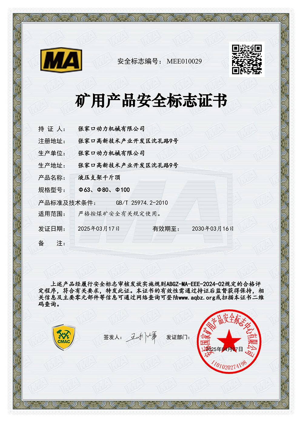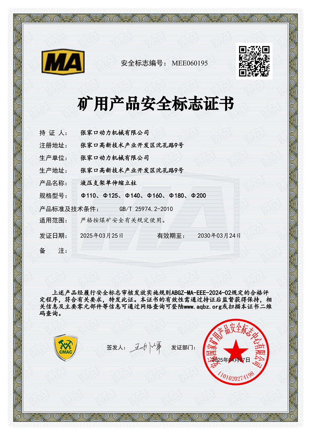 張家口動力機械有限公司生產(chǎn)資質(zhì)展示